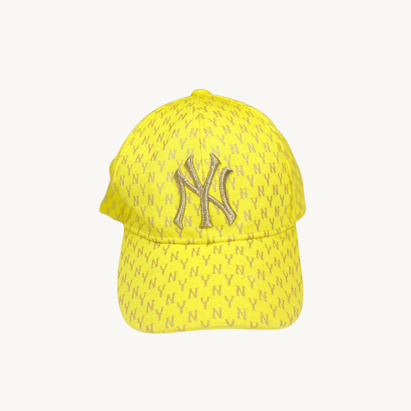 Gorra de Béisbol MLB New York Yankees en color amarillo neón o fluorescente con patrón de monograma repetitivo en toda su superficie. Logo NY bordado en color crema o dorado. Un accesorio extravagante