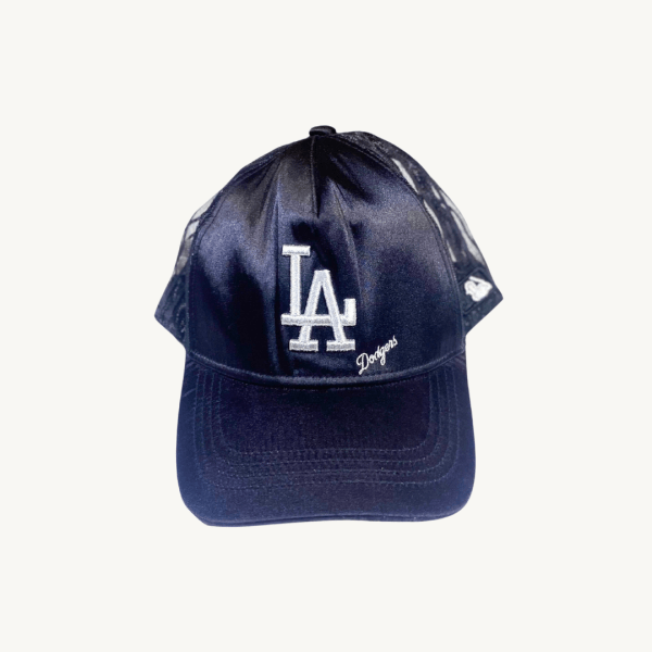 Gorra Trucker MLB Los Angeles Dodgers en color negro satinado con logo LA y texto Dodgers bordado en blanco. Diseño moderno con malla transpirable en la parte trasera, ideal para un estilo urbano