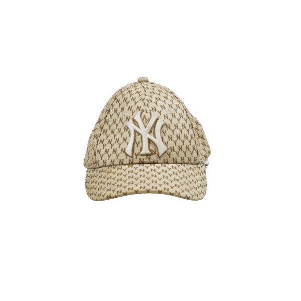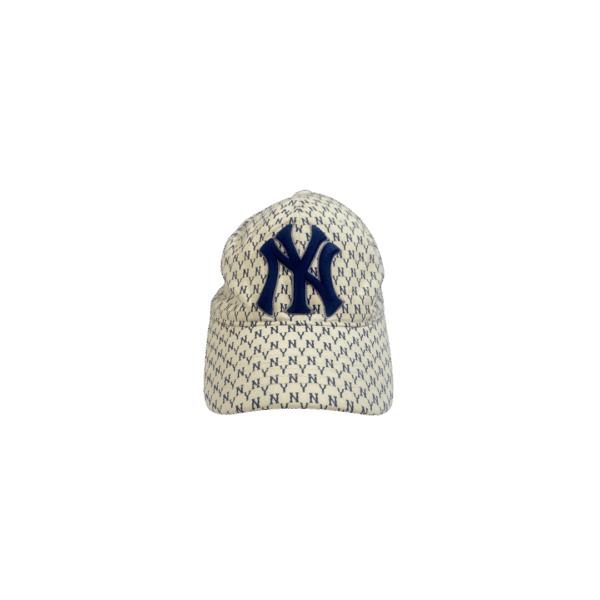 Gorra casual New Era 9Twenty de los New York Yankees con un llamativo diseño. Presenta un estampado de monograma repetido («NY») en color azul marino sobre un fondo crema/blanco roto.