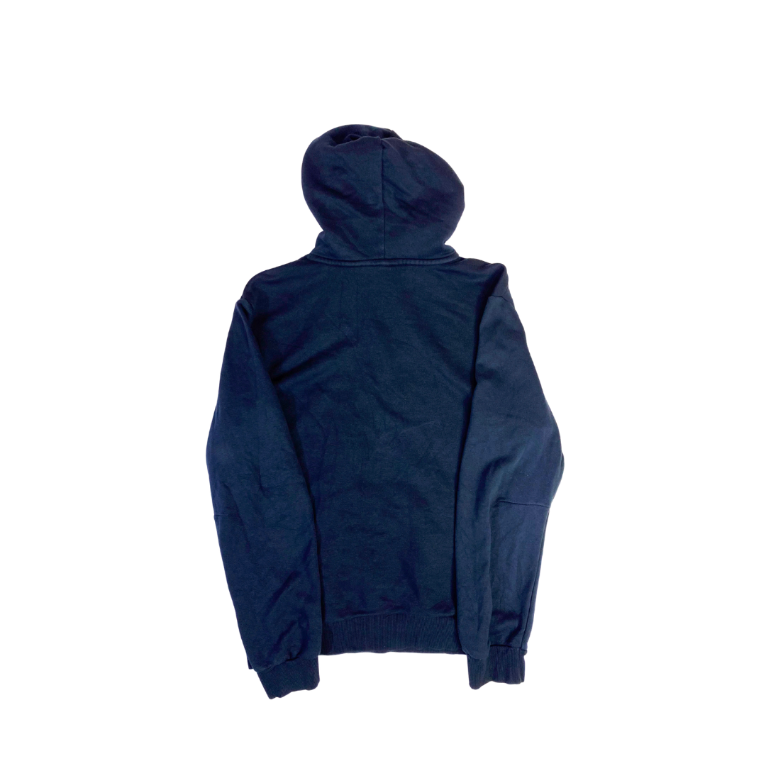 Este polerón Adidas es una prenda clásica de diseño deportivo con capucha ajustable y un amplio bolsillo canguro El foco está en el gran y reconocible logo de las Tres rallas.