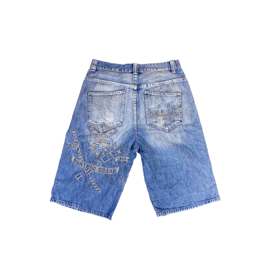 Este short de mezclilla en un lavado claro presenta un corte ancho y holgado de estilo baggy o skater Su diseño frontal y posterior destaca por intrincados estampados y bordados.