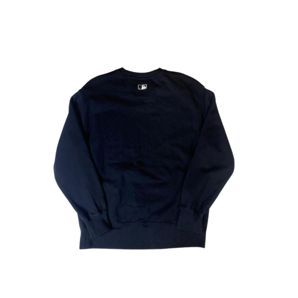Sudadera clásica de cuello redondo en color negro, con el icónico logo «NY» de los New York Yankees bordado o aplicado con un efecto texturizado en tonos morados o lilas.