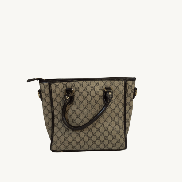 Elegante bolso de mano Gucci en lona con el monograma GG Supreme. Presenta la icónica franja Web verde y roja en el centro y el logo de doble G entrelazada, ofreciendo un estilo de lujo clásico y atemporal.