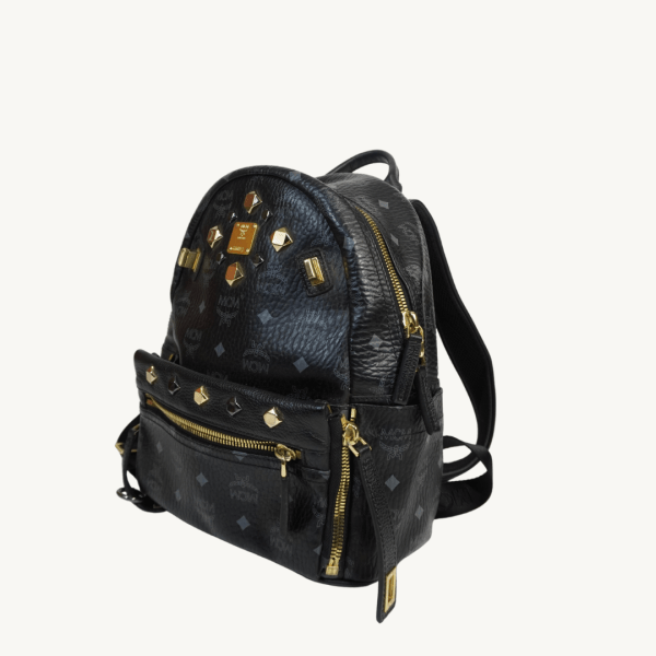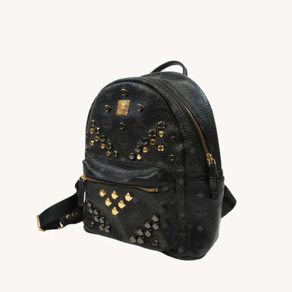 Mochila MCM Stark en piel con el monograma Visetos en negro. Presenta un diseño audaz adornado con múltiples tachuelas y remaches metálicos dorados, ofreciendo un estilo de lujo urbano atrevido.