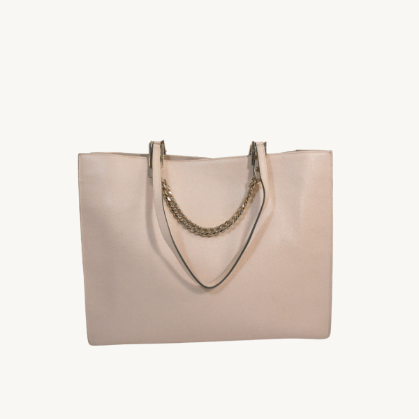 Bolso Furla Tote Cadena. Bolso tipo tote de piel minimalista en color rosa palo o nude. Diseño elegante con asa de cadena dorada decorativa y el logo FURLA de metal.