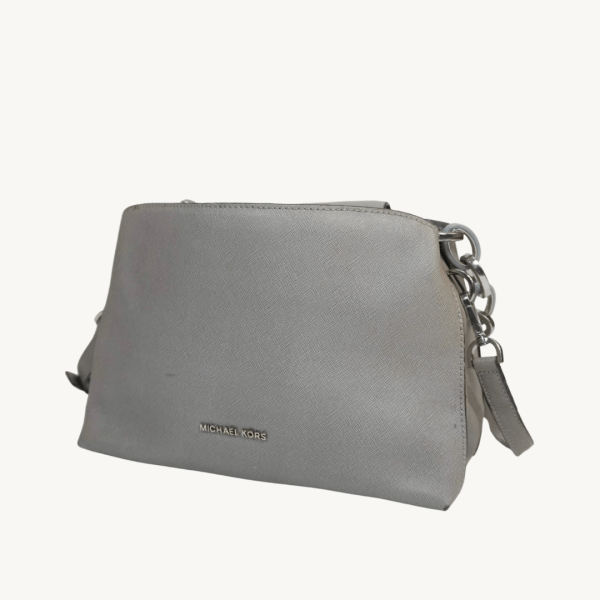 Bolso Michael Kors Bandolera. Bolso tipo crossbody de diseño minimalista en piel saffiano gris claro o topo. Ideal para el uso diario, ofrece un estilo elegante y estructurado. Logo de metal plateado.