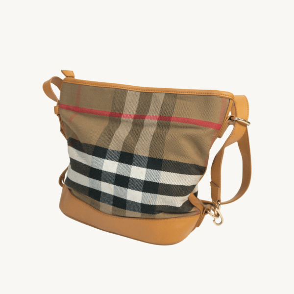 Bolso Burberry Bandolera Bucket. Bolso de hombro tipo cubo con el clasico patron de cuadros Burberry Check. Base y correa de piel en color marron caramelo. Elegancia casual britanica y diseño versatil.