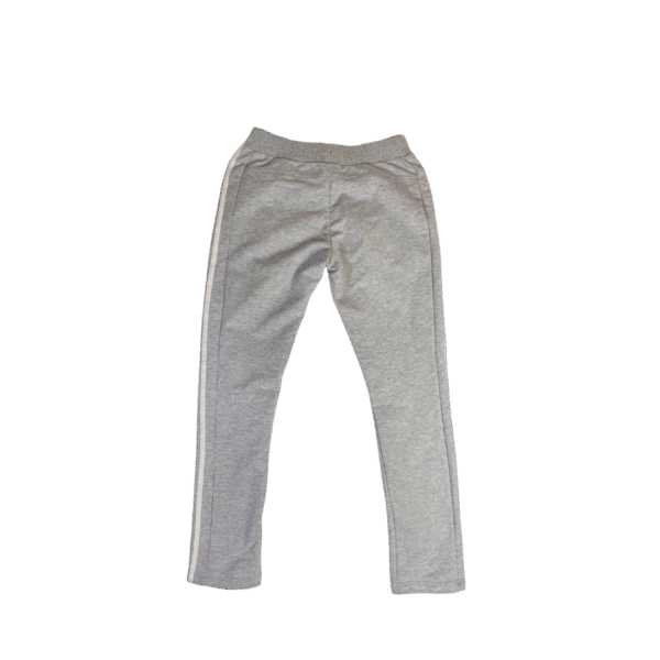 Este pantalón deportivo Adidas es un clásico de la marca que presenta un ajuste delgado y el icónico diseño de las tres rayas laterales en blanco sobre un fondo gris jaspeado.