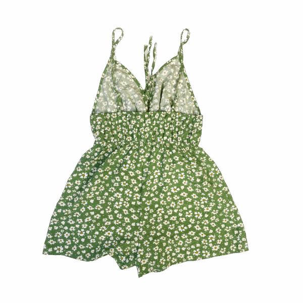 Este jumpsuit o enterito corto es una prenda de verano con una base de color verde vibrante y un denso estampado de pequeñas margaritas blancas y amarillas. Presenta un escote en V o corazón, tirantes.