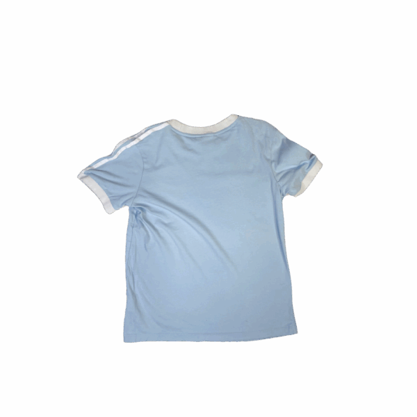 Esta polera Adidas Originals de estilo ringer es de un suave color celeste claro. Presenta el icónico logo del Trébol (Trefoil) bordado o estampado en el pecho y las clásicas Tres Rayas en los hombros.