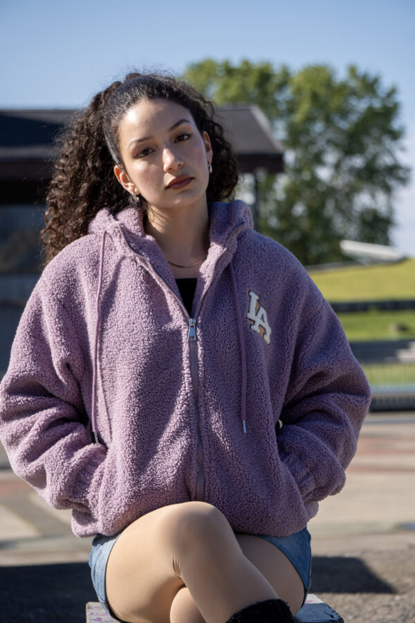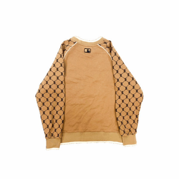 Moderna sudadera de cuello redondo en color rosa lila, con un llamativo print de monograma repetido de ‘NY’ y ‘AN’, y el logo grande de los Yankees en el centro del pecho.