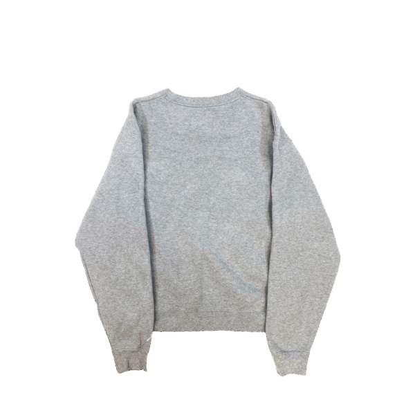 Sudadera Champion blanca de cuello redondo y estilo retro. Presenta el logo de Champion en fuente script azul marino y rojo en el pecho, y el logo C pequeño en la manga, ideal para un estilo deportivo