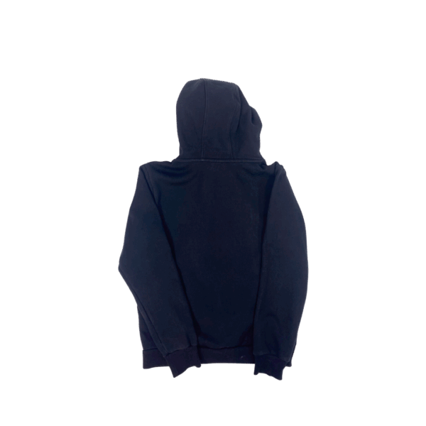 Capucha negra con el logo FILA grande en rojo, negro y blanco, y el texto MILANO debajo. Diseño urbano y deportivo con bolsillo canguro. Prenda cálida y cómoda.