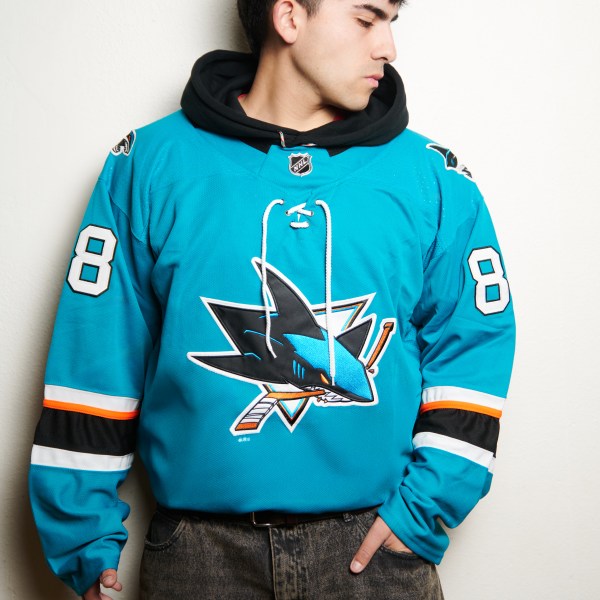 Jersey San Jose Sharks NHL. Camiseta de hockey sobre hielo en color verde teal clasico con el logo del tiburon. Diseño oficial y autentico de la NHL, con detalles en negro y naranja.