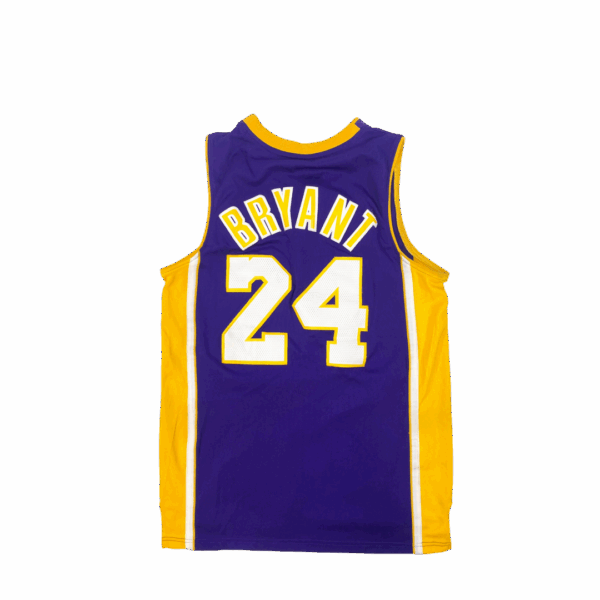 Uniforme de baloncesto morado y amarillo. Incluye el número 24 y el nombre Lakers en el pecho. Fabricada en malla transpirable por Adidas. Un tributo al legendario Kobe Bryant.