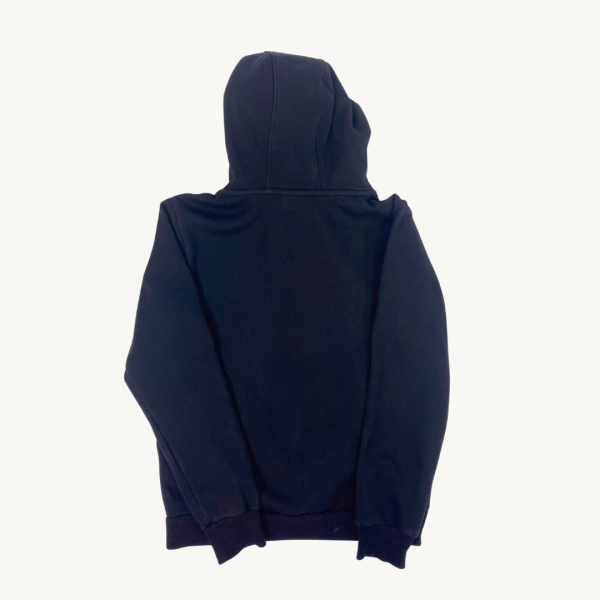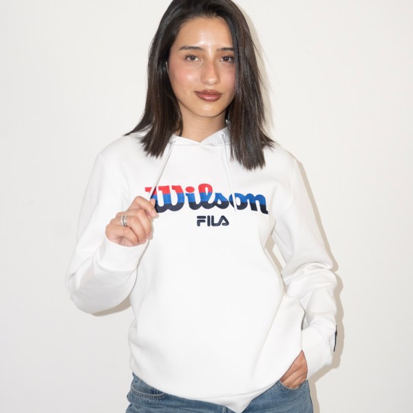 Capucha negra con el logo FILA grande en rojo, negro y blanco, y el texto MILANO debajo. Diseño urbano y deportivo con bolsillo canguro. Prenda cálida y cómoda.