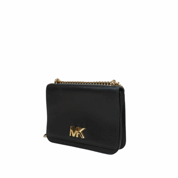 Bolso Michael Kors Bandolera Cadena. Bolso crossbody de solapa en piel negra con elegante correa de cadena dorada. Detalle de logo MK en metal dorado. Ideal para salidas nocturnas o un look de noche.