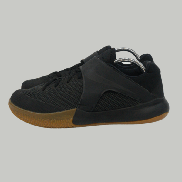 Zapatillas de entrenamiento o cross-training en color negro con un diseño minimalista y sleek. Destacan por su construcción de malla y paneles de soporte, y la suela exterior de goma color caramelo