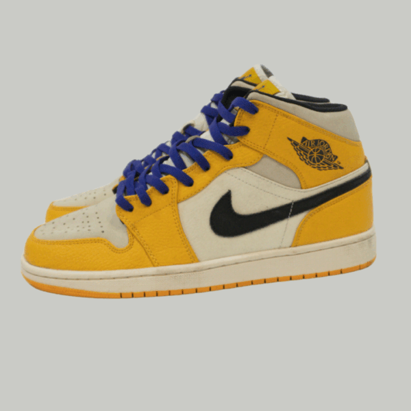 Zapatillas Air Jordan 1 Mid con diseño inspirado en colores de baloncesto, combinando paneles en amarillo dorado y blanco crema con detalles en negro y morado. Un clásico de sneaker culture con un estilo clasico y urbano.