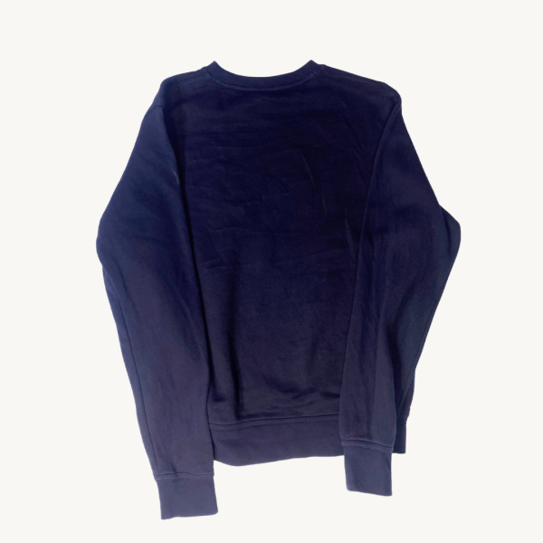 Poleron Nike azul marino de cuello redondo con el icónico logo Swoosh bordado en un tono azul vibrante en el pecho. Comodidad mínima y estilo deportivo.