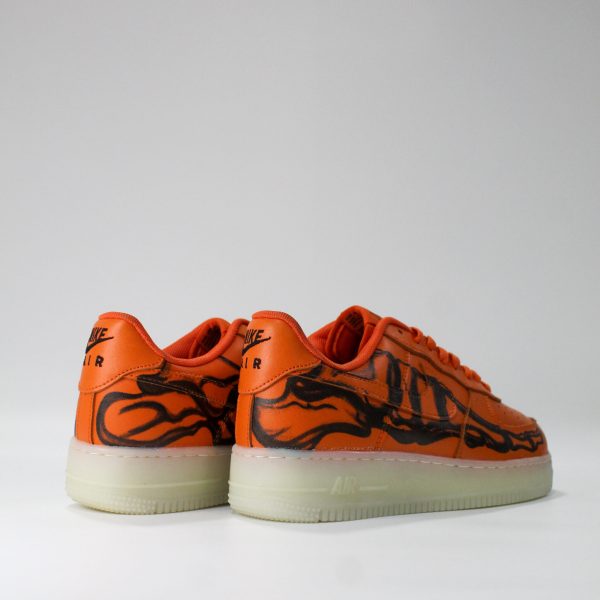 Zapatillas Nike Air Force 1 Skeleton Orange, con diseño icónico y gráfico del esqueleto en los laterales. Edición especial que combina estilo urbano y detalles únicos para destacar en cualquier outfit.