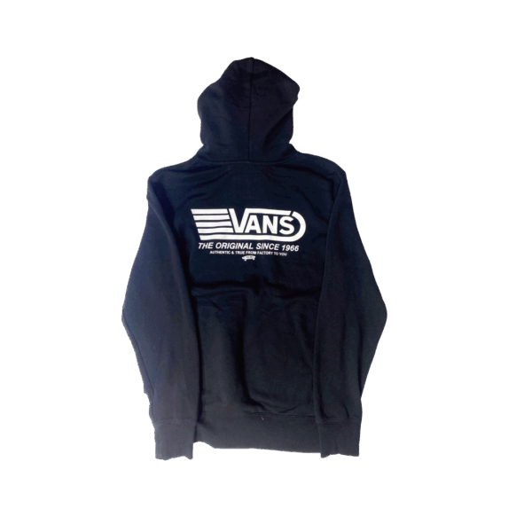 Sudadera Vans negra con capucha y el logo de la marca en el pecho. Comodidad esencial y estilo skatewear auténtico y atemporal.