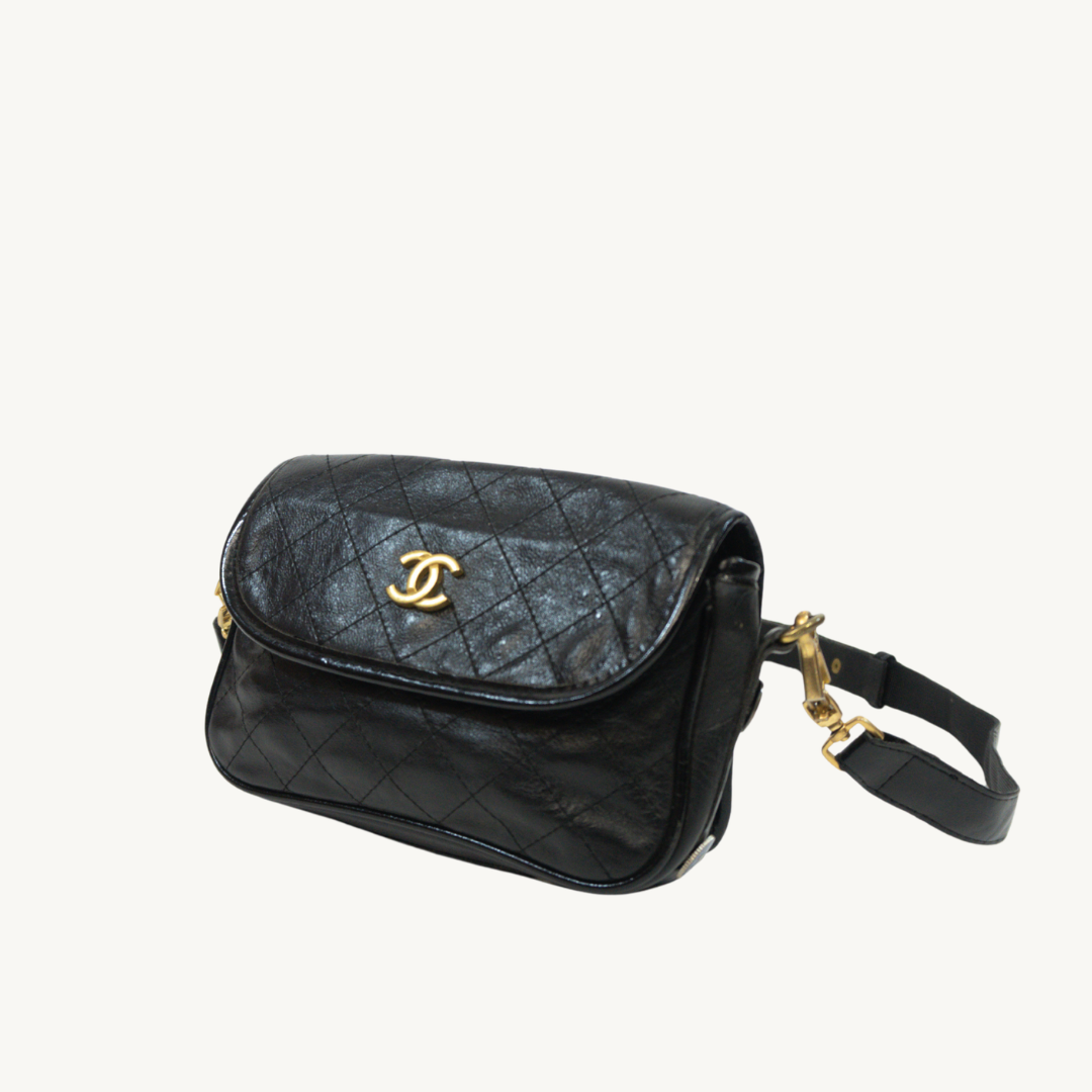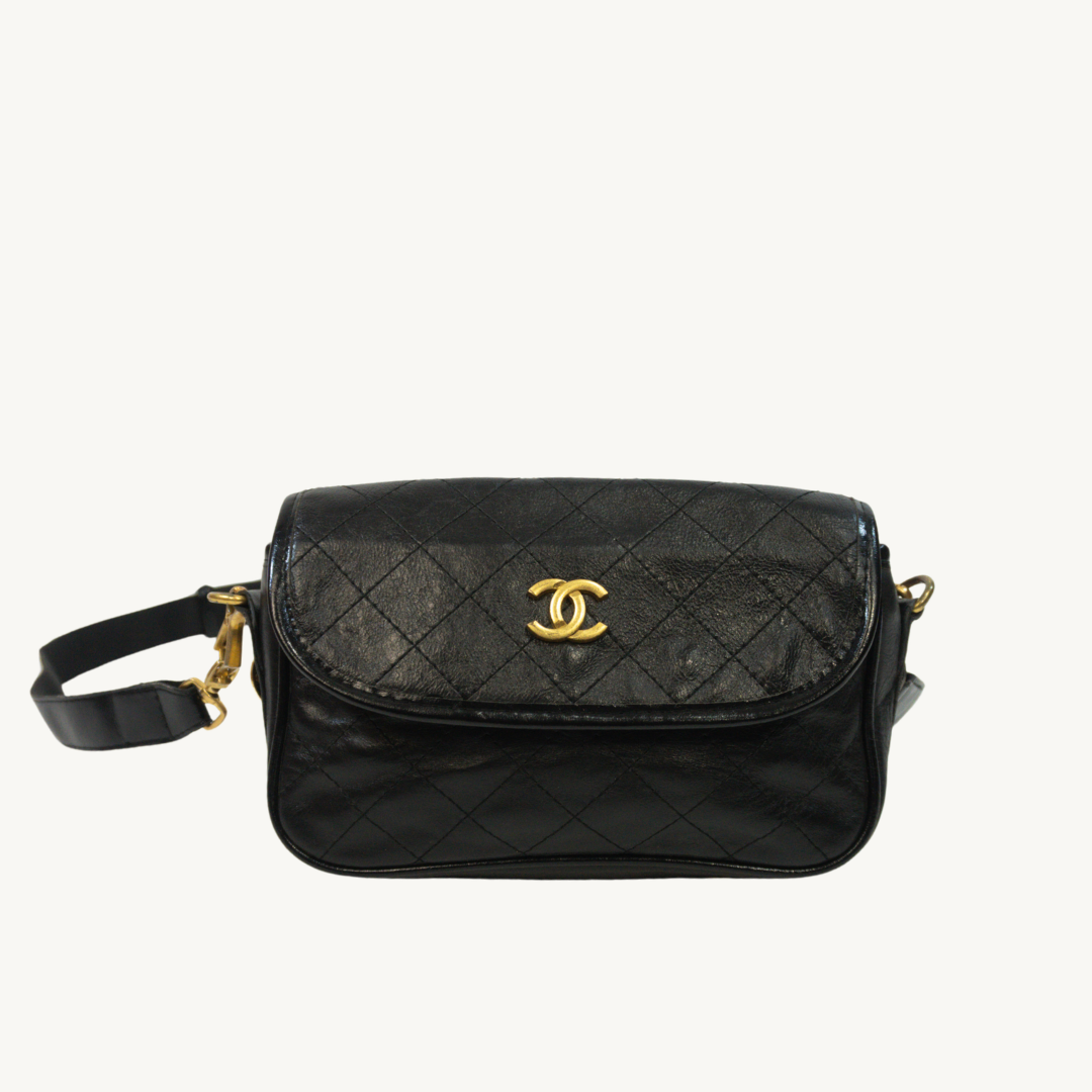 Este es un elegante y codiciado bolso de hombro o bandolera de Chanel, con un diseño que evoca la época vintage de la casa de modas. Está confeccionado en piel de cordero o becerro de color negro, destacando el famoso y reconocible patrón acolchado de diamante o matelassé. El bolso tiene una silueta compacta con una solapa frontal que se cierra con el icónico logo de doble C entrelazada en metal dorado brillante. La correa es de cuero, posiblemente con eslabones de cadena dorados discretos o ajustables, diseñada para llevarlo al hombro o cruzado. La construcción de cuero suave sugiere una comodidad y un acabado de alta calidad. Es una pieza de inversión que simboliza la sofisticación atemporal y el lujo discreto característicos de la marca Chanel.