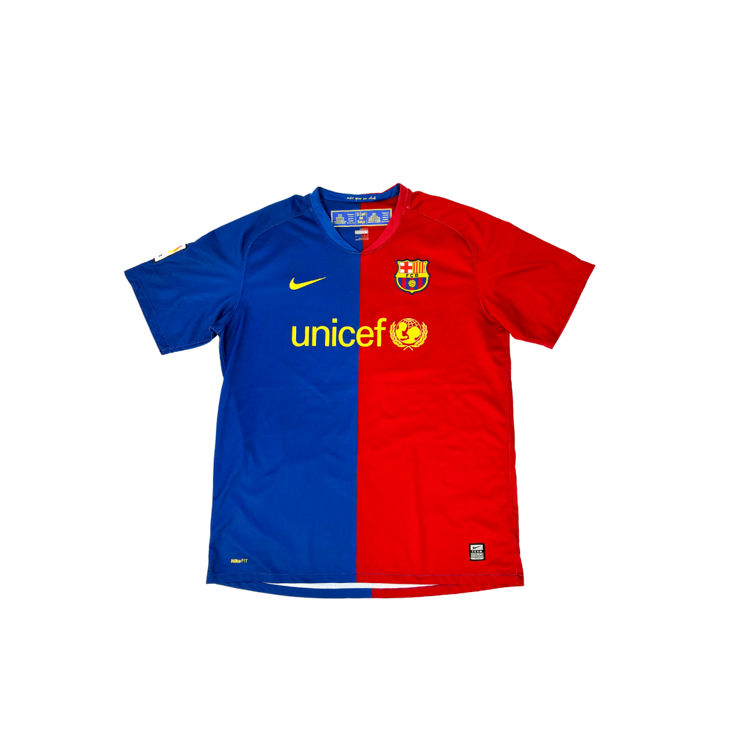 Lleva una pieza de la historia del futbol con esta camiseta del FC Barcelona, un modelo de la primera equipacion que se destaca por su diseño dividido en dos mitades perfectas: el lado azul y el lado grana o rojo. Este diseño inusual es muy buscado por coleccionistas y aficionados.