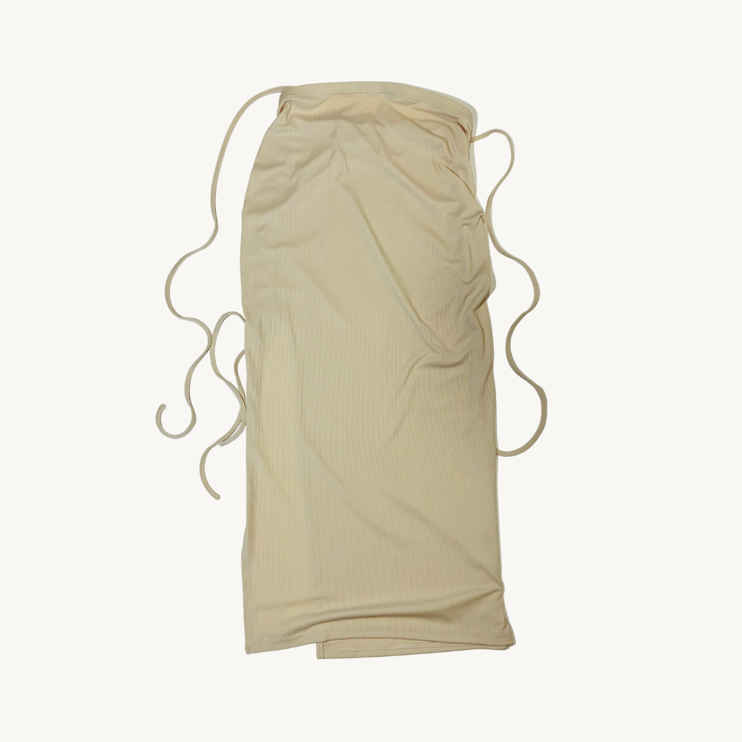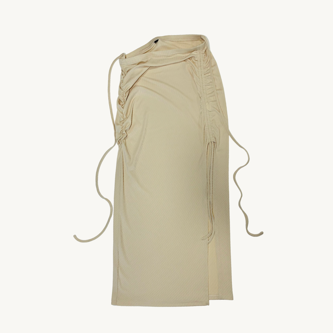 Dale un toque sofisticado a tu look con esta falda midi de punto acanalado. Su diseño cuenta con cordones laterales que te permiten regular el largo y el recogido a tu gusto, creando un efecto drapeado.