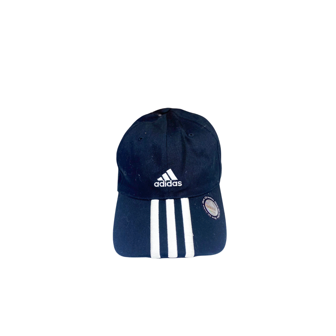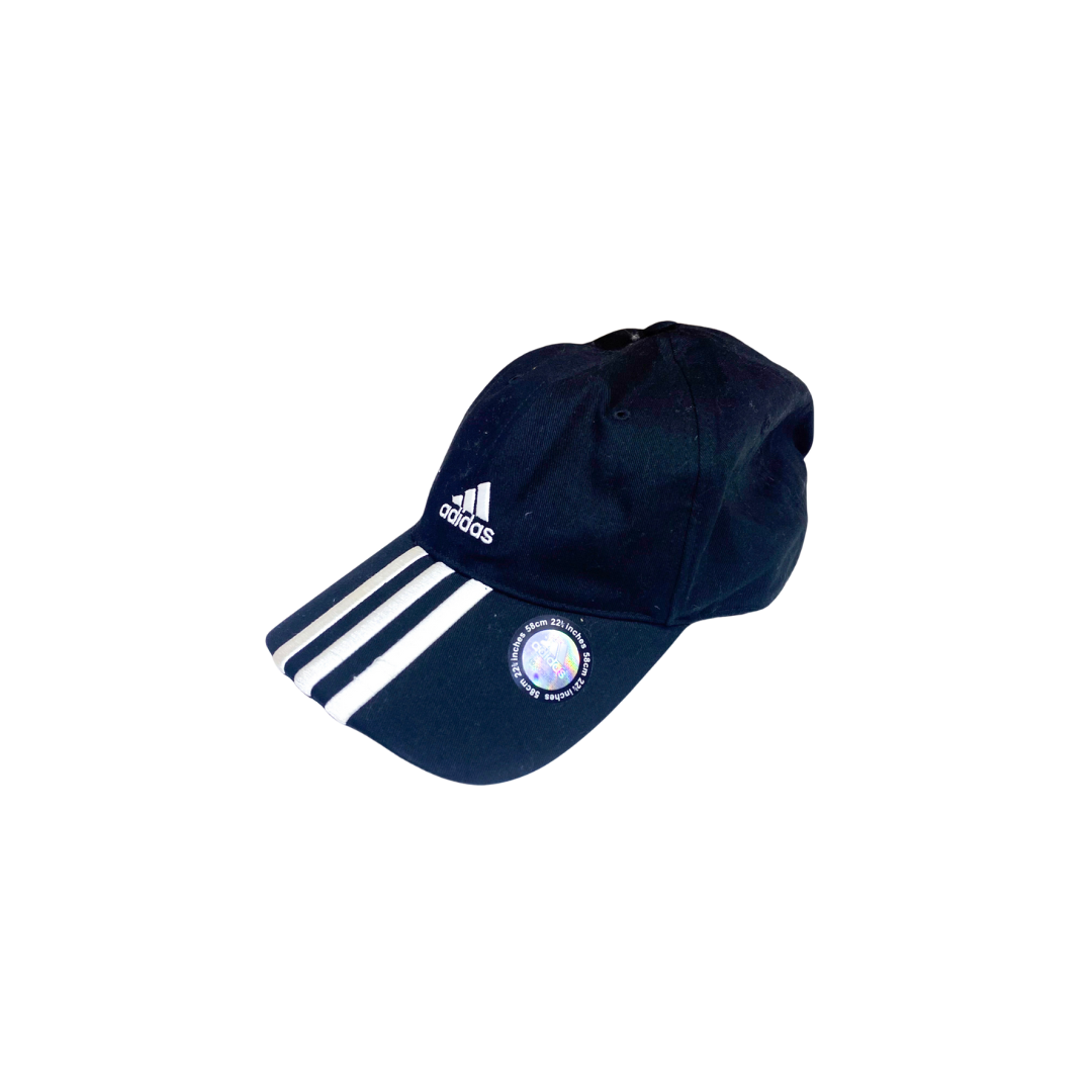 Gorra Adidas de color negro clásico con las tres franjas blancas icónicas en la visera. Un accesorio deportivo y casual, ideal para entrenamiento o uso diario. Ofrece protección solar y un ajuste cómodo