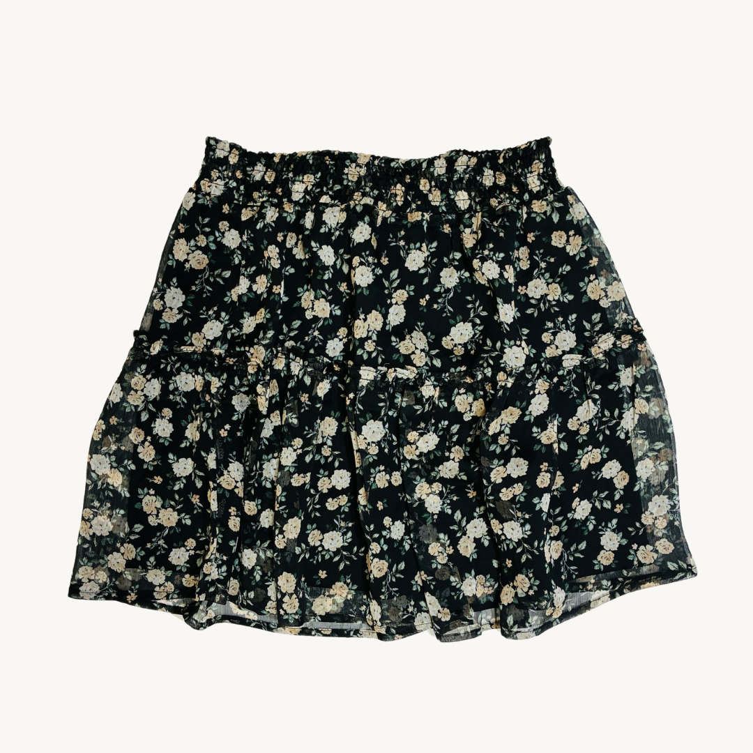Añade un toque femenino a tu outfit con esta falda corta de la marca CKH. Con un delicado estampado floral blanco sobre un fondo oscuro, esta prenda destaca por su diseño de volados y su pretina elastica.