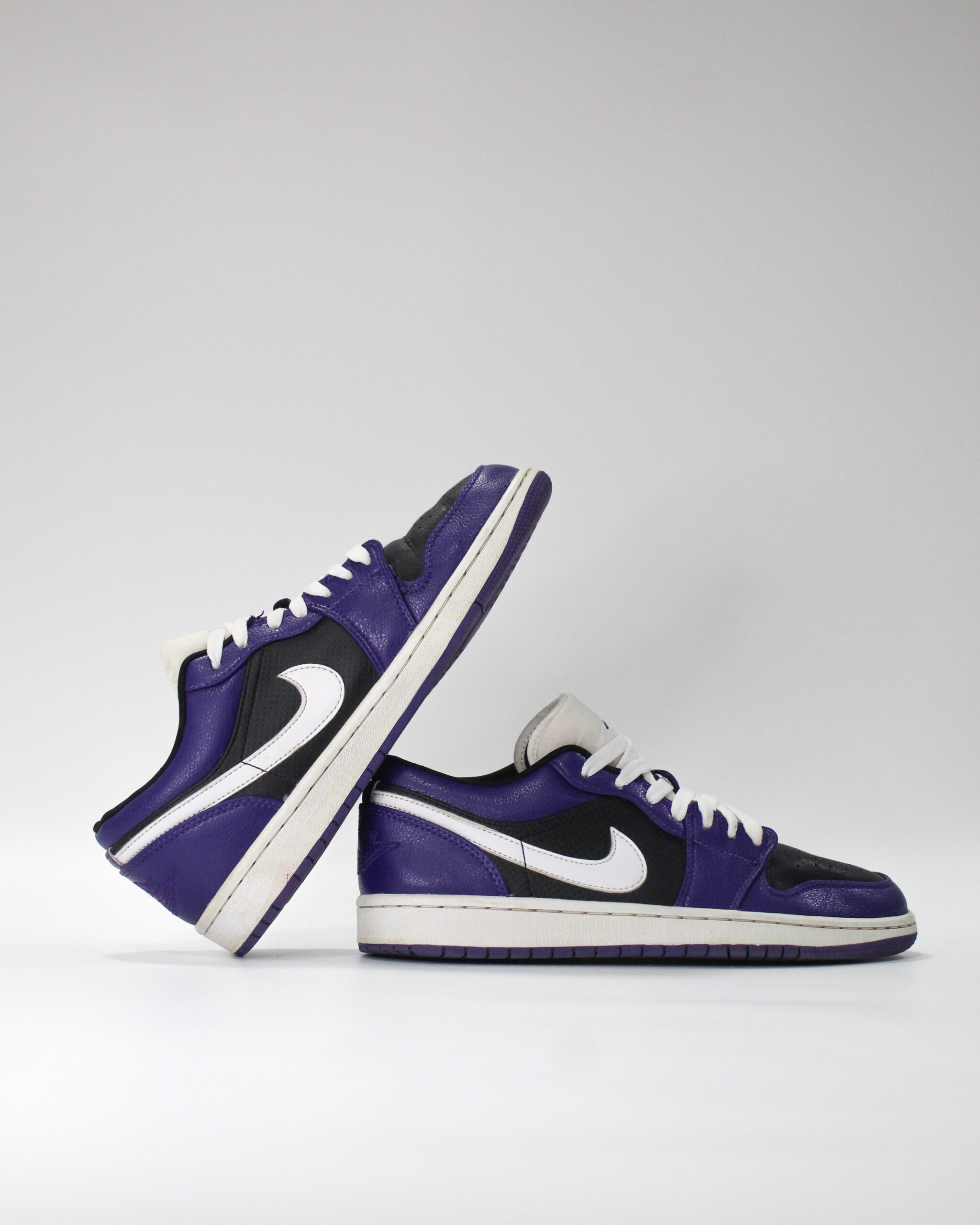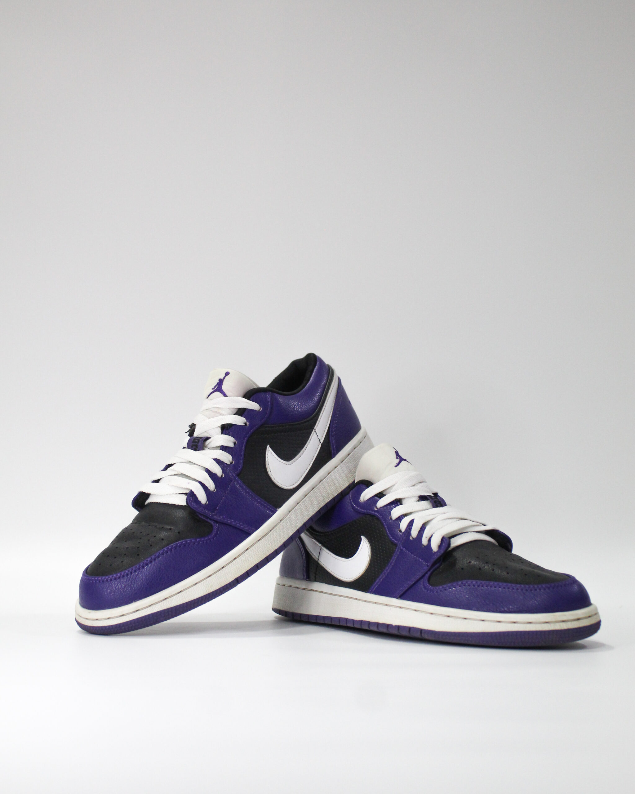 Estilo clásico Jordan 1 Low con combinación de colores violeta blanco y negro Parte superior de cuero que ofrece durabilidad y estilo