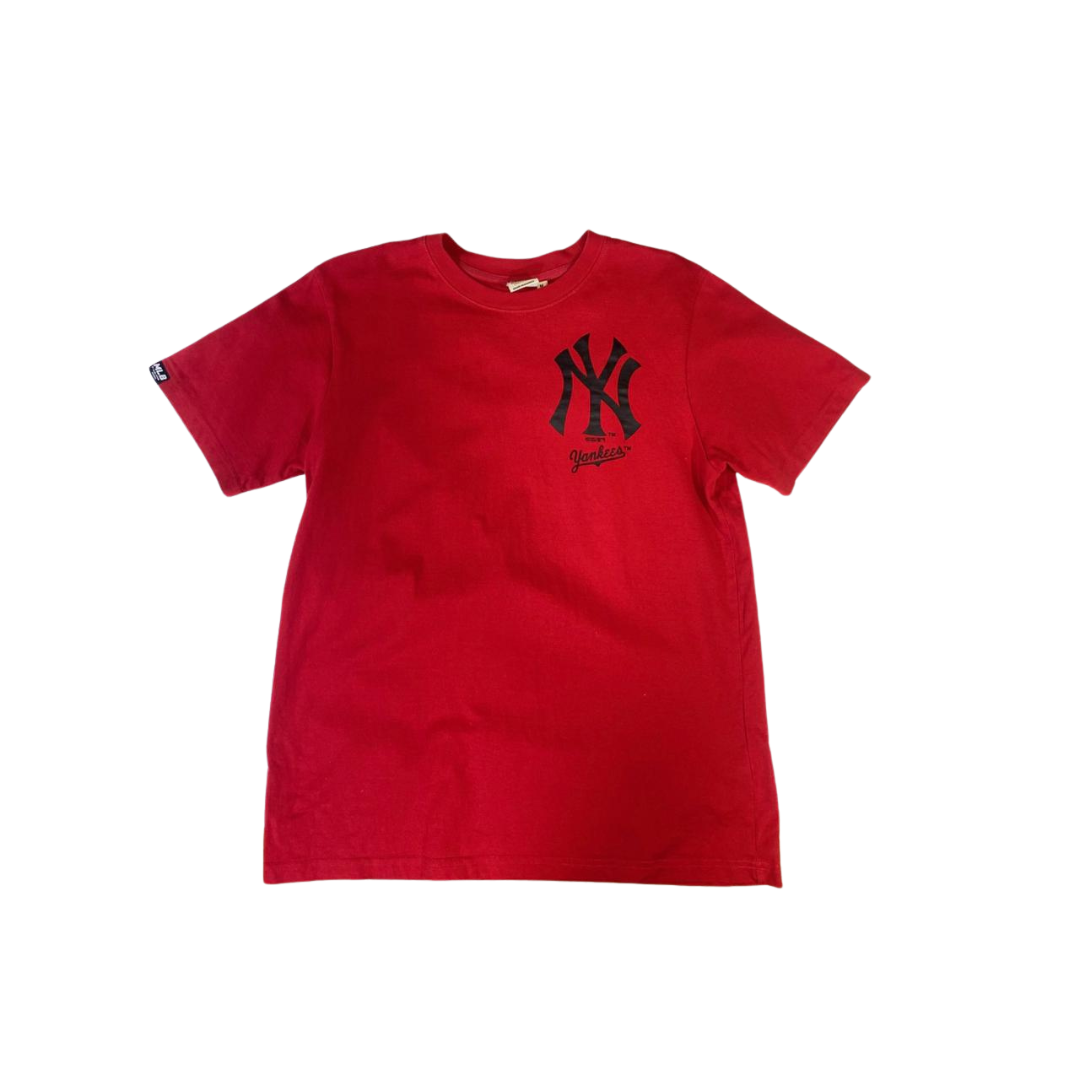 Clásica polera de manga corta en color rojo vibrante con el icónico logo de los New York Yankees bordado o estampado en color negro en el lado izquierdo del pecho.