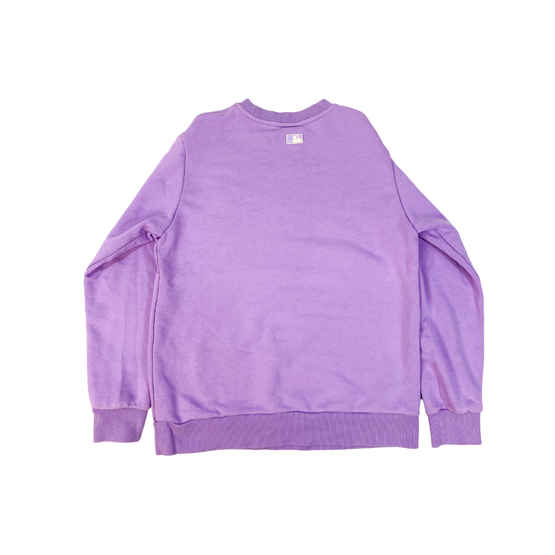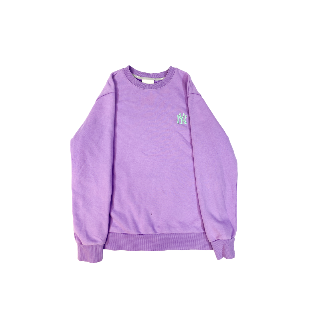 Poleron New York Yankees Crewneck. Color lila vibrante con el logo NY bordado en verde menta o turquesa. Una pieza de sportswear que combina el icono del beisbol con una paleta de colores moderna.